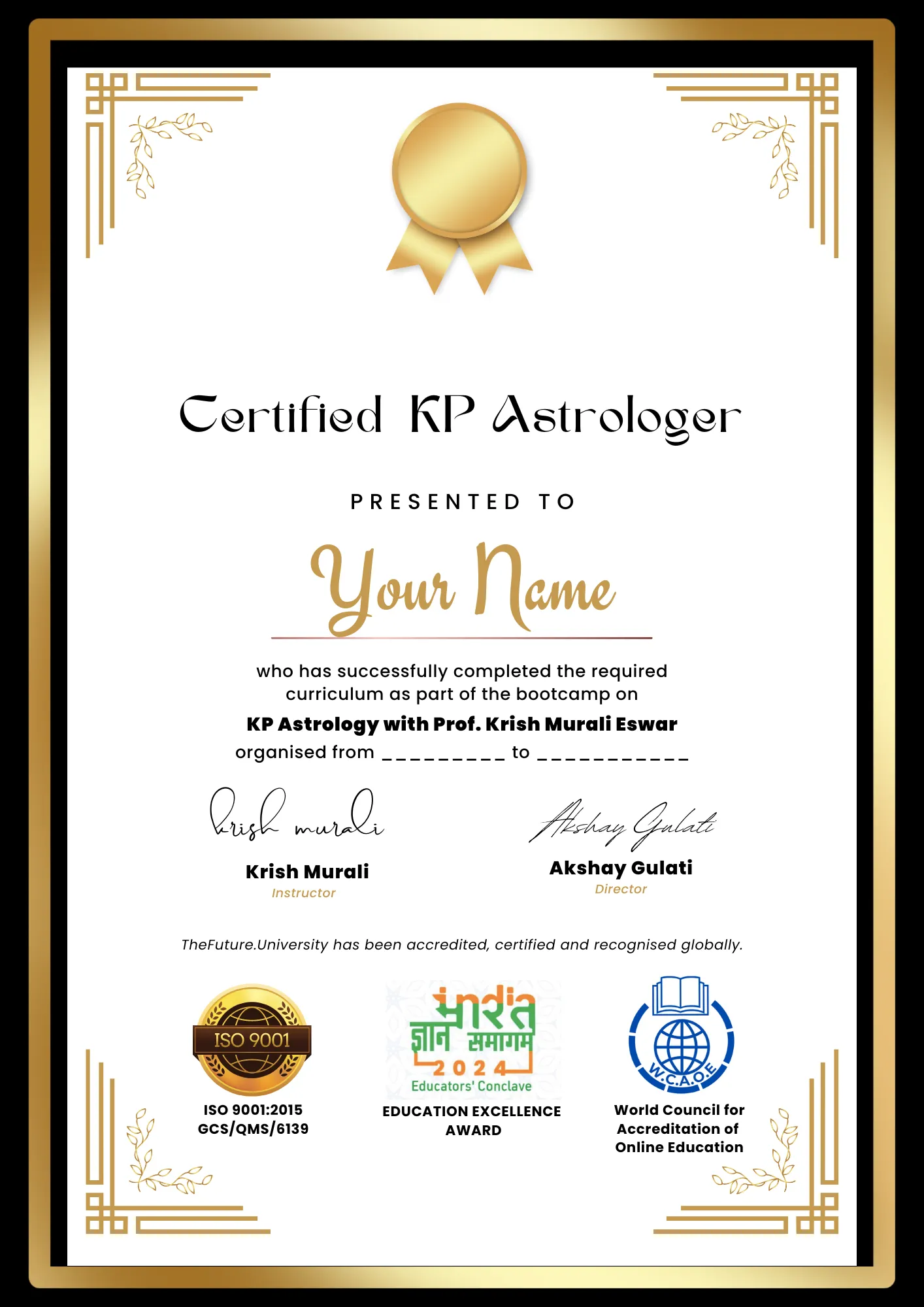 I am thrilled with the knowledge I gained from Prof Krish Murali Eswar's KP Astrology masterclass. The course covered everything from basic principles to the differences between Vedic and KP Astrology. The use of Horary Numbers for precise predictions was particularly fascinating. Analyzing real-life case studies provided practical insights, and the bonus prediction session was a great hands-on experience. Truly valuable!